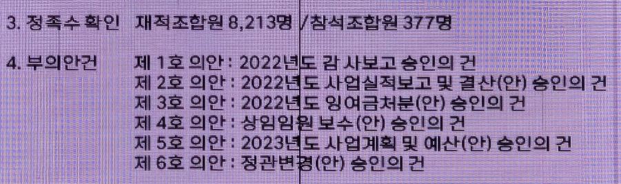두 시부터 시작해서 감사보고 승인건 등 6호 의안에 대해서 설명하고 결정하는 순서로 진행되었고 대략 1시간 정도 걸린 것 같습니다.